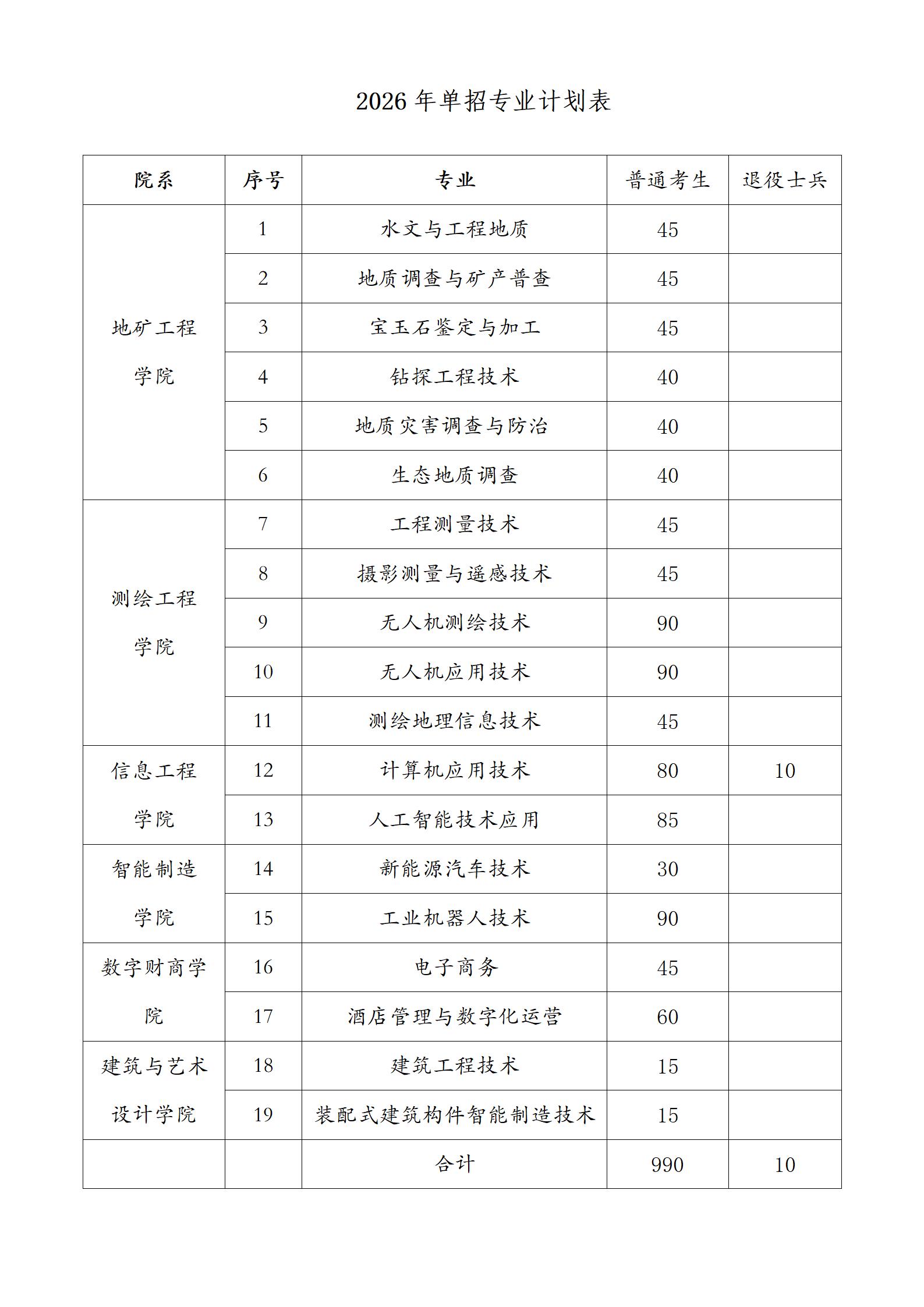 河南地矿职业学院2026年单招计划